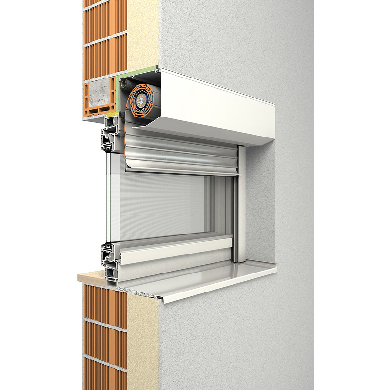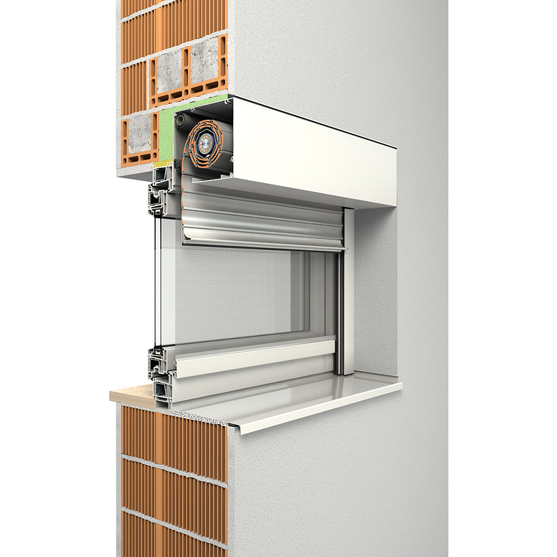 Kennzeichen ist die fünfeckige Kastenform und individuelle Zusatzausstattungen wie etwa Insektenschutzgitter ergänzen dieses Rollladensystem.